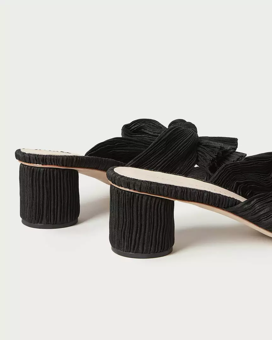 Pleated mid-heel sandal in black organza fabric topped with our signature knotted bow. Features a padded footbed with gold stamped logo. Open toe, slips on. 2 inch heel.