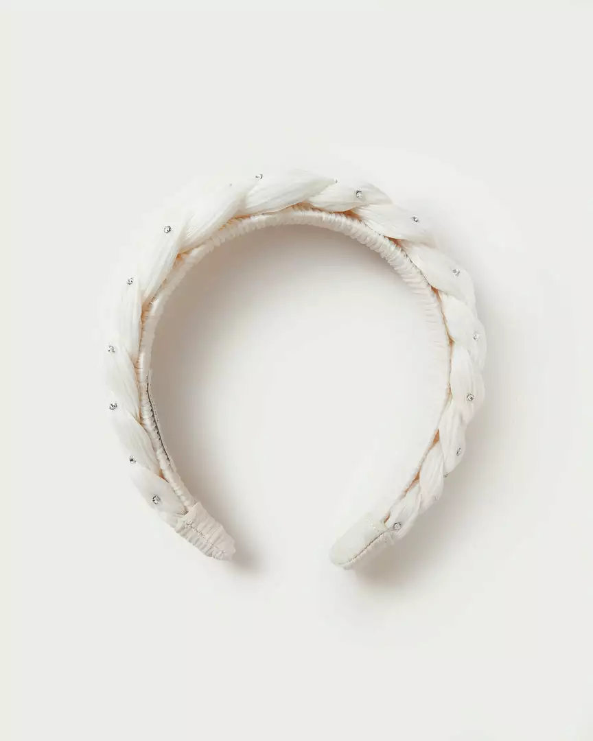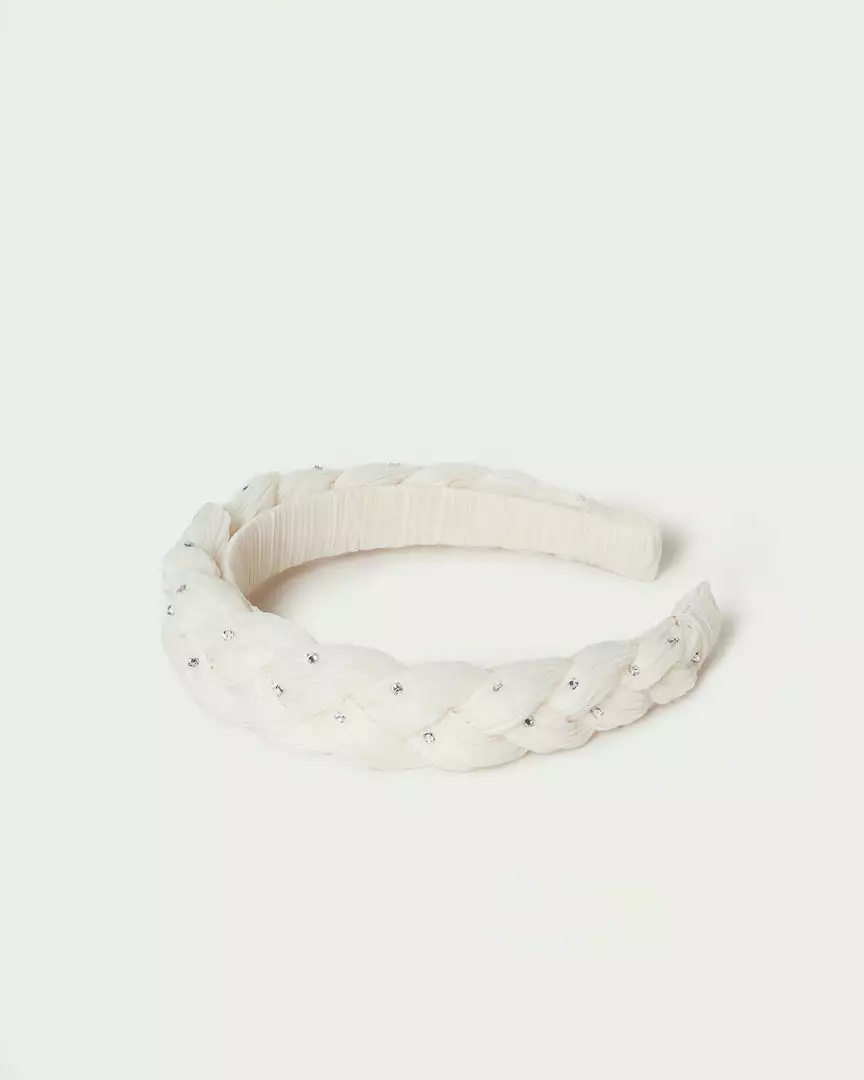 Braided headband in pleated pearl white fabric with rhinestone embellishment.