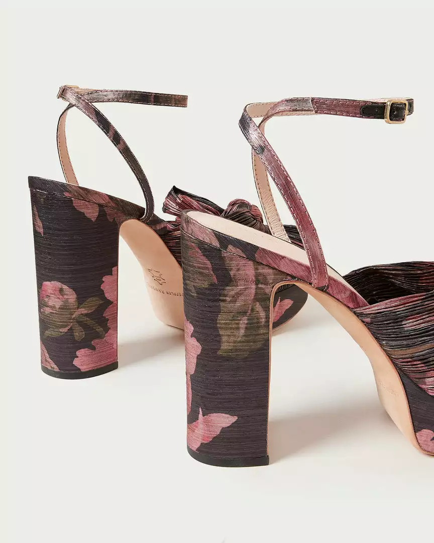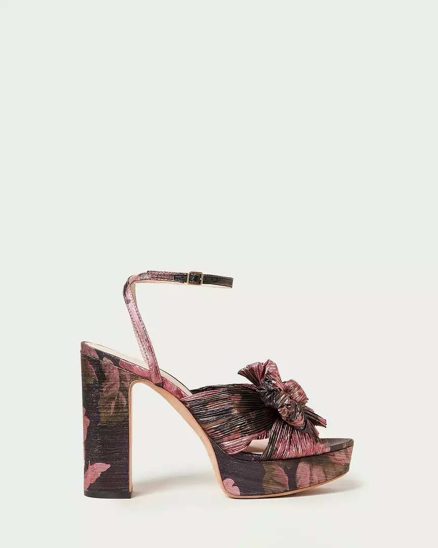 Pleated heeled platform sandal in metallic dark floral-printed Italian lamé topped with our signature knotted bow. Features a padded footbed with gold stamped logo, an open toe, and an adjustable buckle ankle strap. 4.5 inch heel, 1 inch platform.