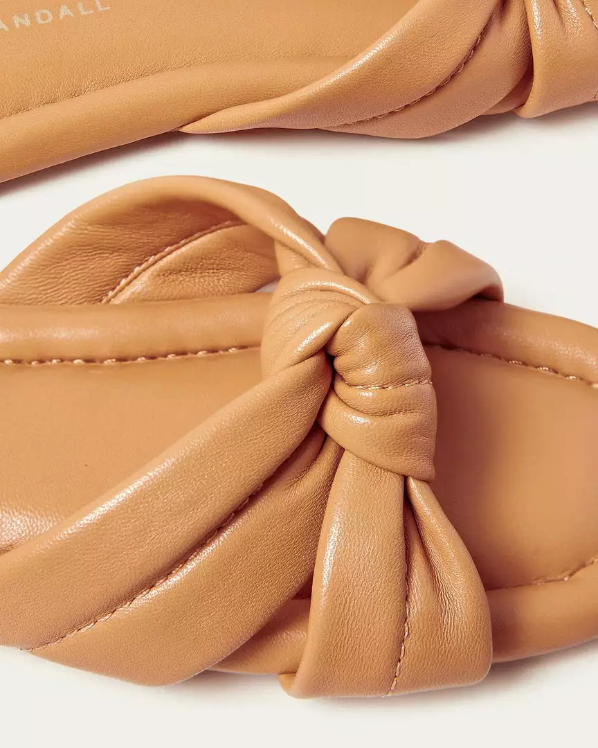 Knotted slide sandal in caramel tan glove calf leather. Puffy padded footbed with gold stamped logo.