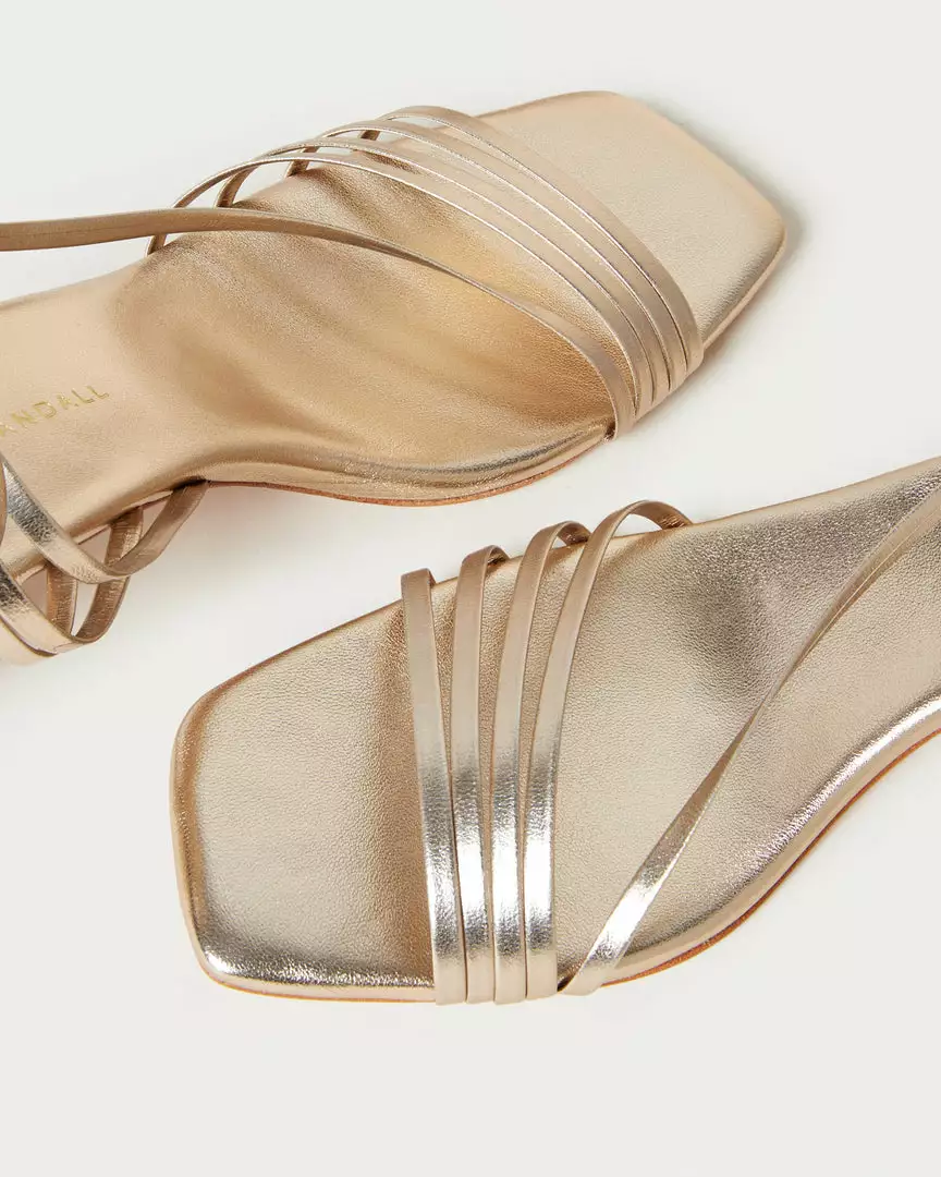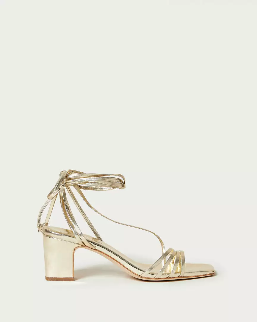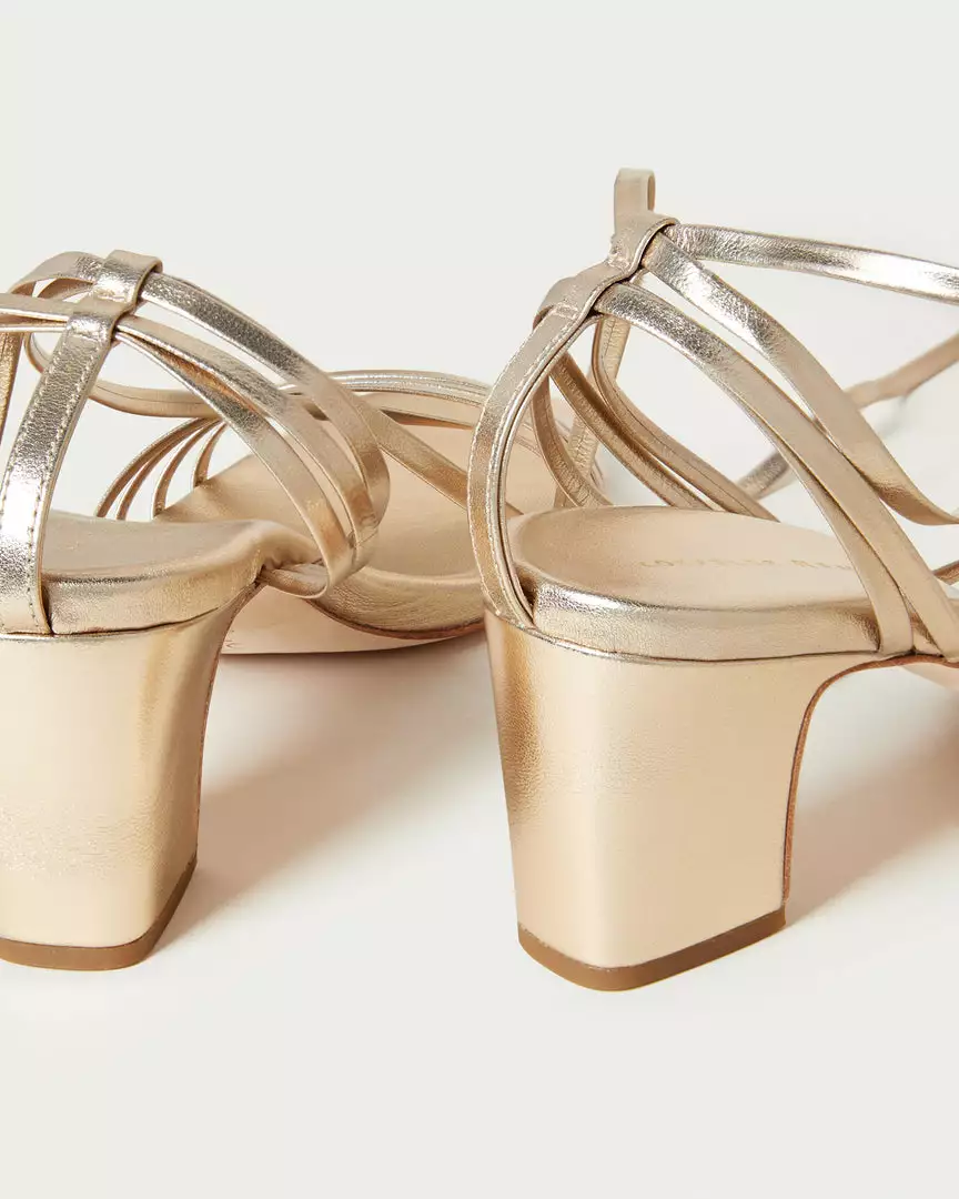 Strappy mid-heeled sandal in metallic champagne Italian leather. Features a gold stamped logo, an open, square, toe, and adjustable ankle wrap tie. 2.5 inch heel.