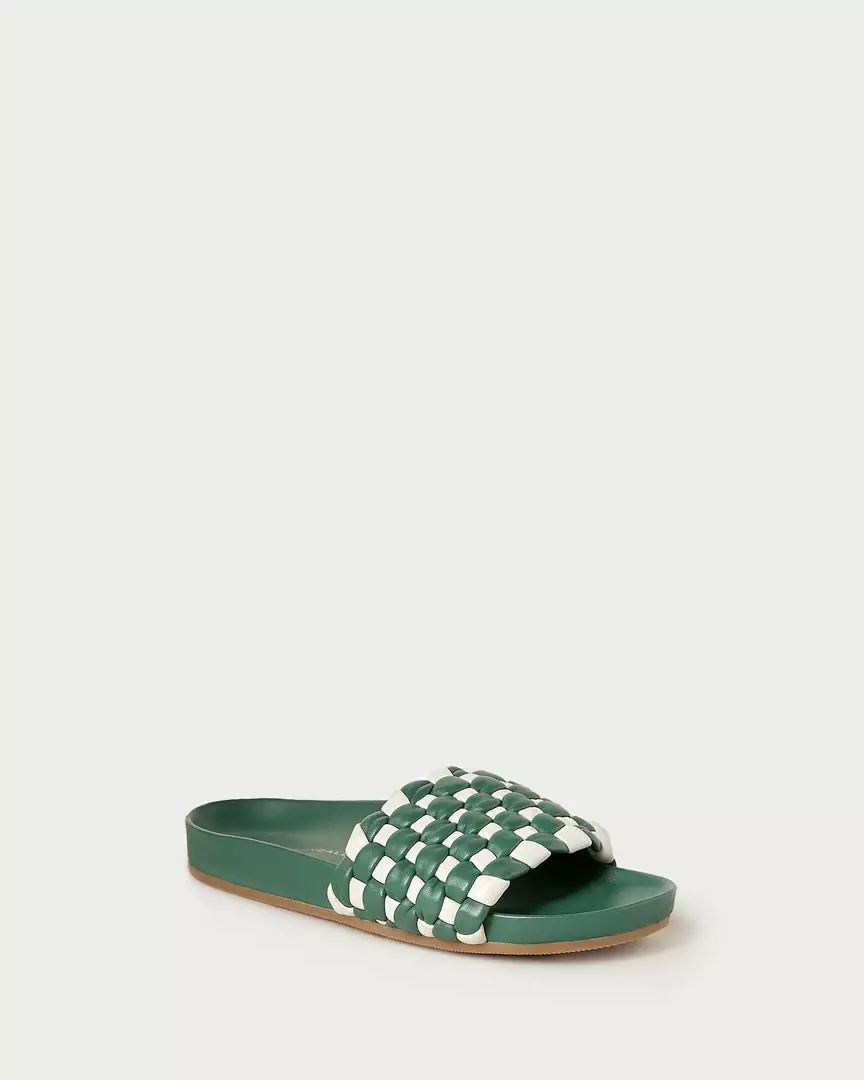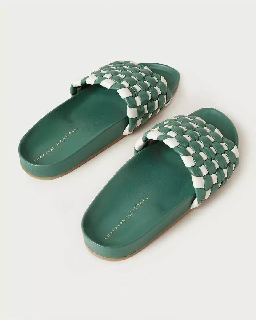 Puffy flat slide sandal with a woven kelly green leather upper and a leather wrapped padded footbed.