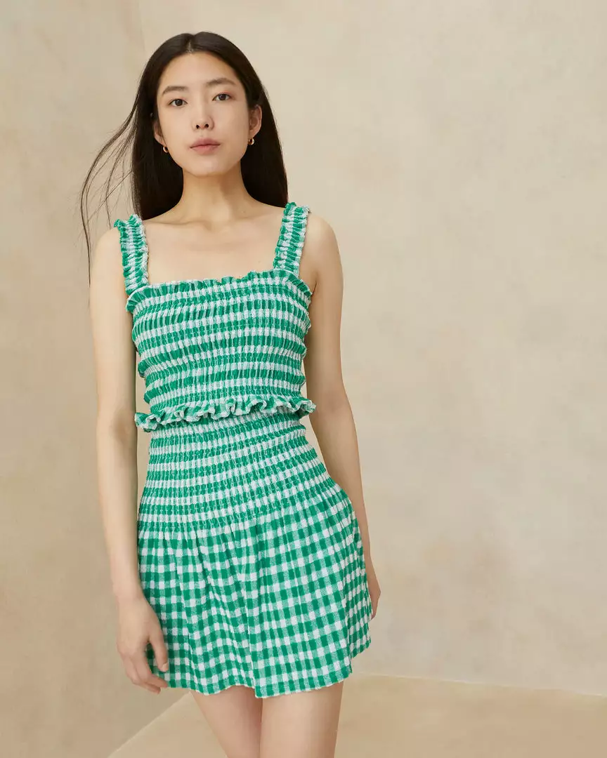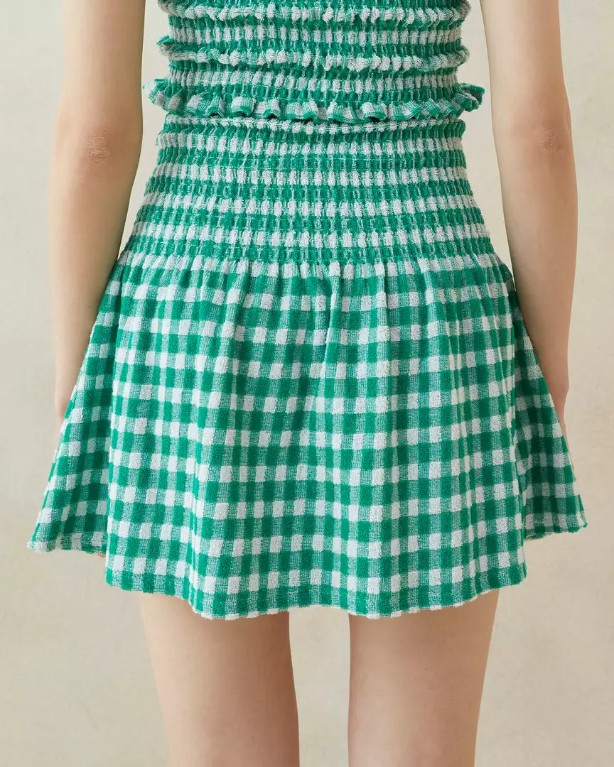 Smocked mini skirt in green and cream gingham terrycloth featuring a drop waist construction.