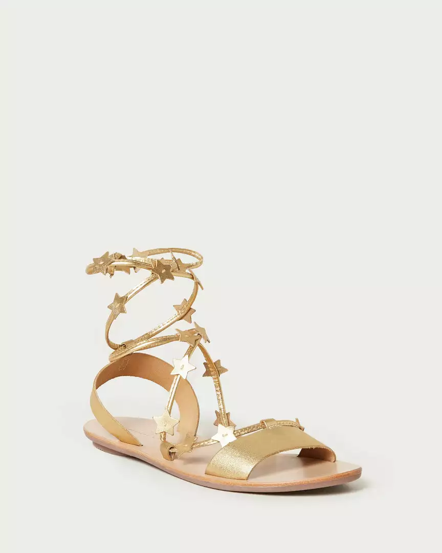Flat sandal in gold metallic leather with gold star detail. Gold stamped logo, open toe, ankle wrap and tie.
