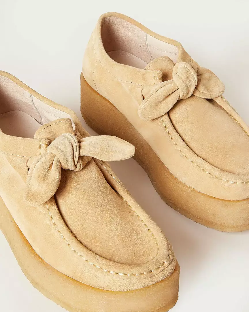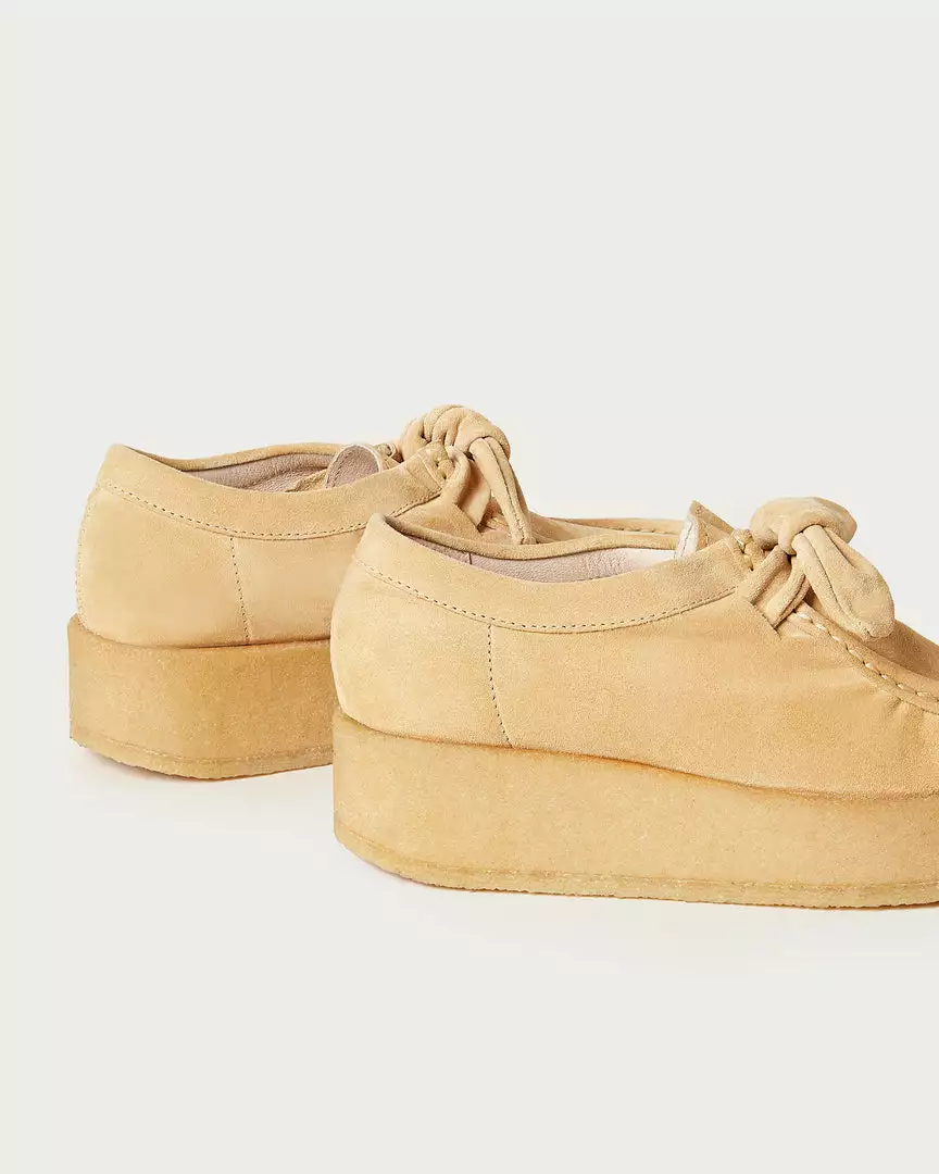 Chukka style slip-on shoe with knot detail in sand tan suede. 0.5″ sole.