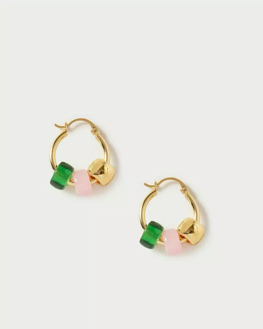 Gold hoop earring with green, pink, and gold beads. Brass pin closures.