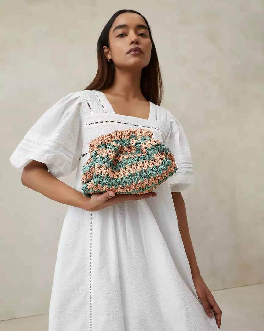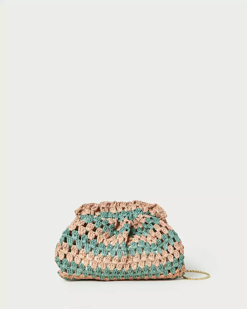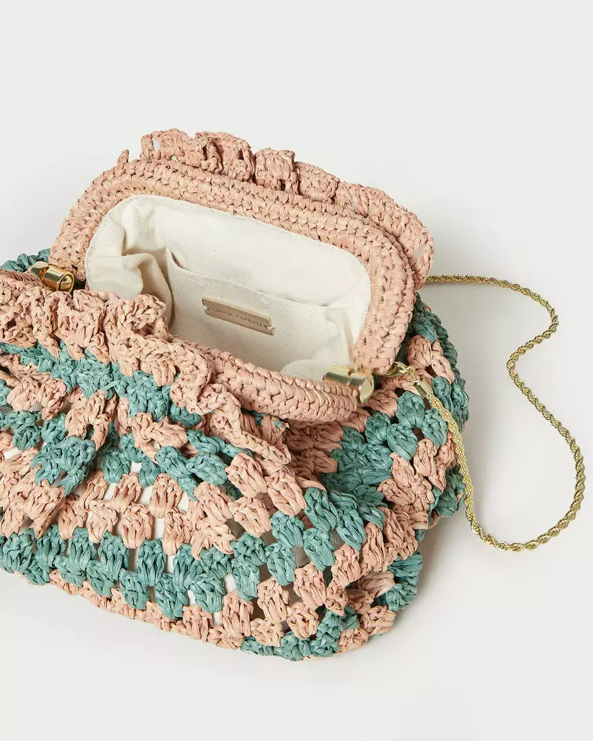 Gathered mini frame clutch in green and pink crocheted raffia. Features a removable twisted gold chain crossbody strap, frame closure, and full lining.