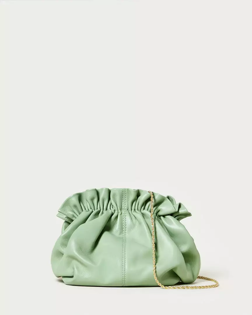 Gathered mini frame clutch in sage green nappa leather. Features a removable twisted gold chain crossbody strap, frame closure, and full lining.